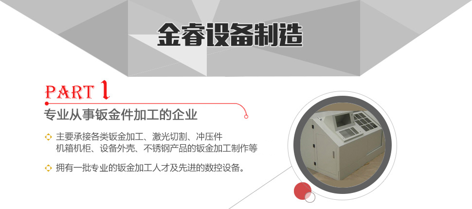 合肥金睿機械制造有限公司是一家長期從事鈑金件加工的新技術股份制企業,主要承接各類鈑金加工、激光切割、沖壓件、機箱機柜、設備外殼、不銹鋼產品的鈑金加工制作等。公司坐落于安徽省肥東縣龍塘青年工業園,距合肥繞城高速龍塘出口僅2公里,華東建材城對面,交通十分便利,地理位置優越?,F擁有廠房建筑面積2000余平方米,員工30余人。   合肥金睿機械制造有限公司擁有一批專業的鈑金加工人才及先進的數控設備。主要針對:農業設備、汽車、醫療設備、金融、電信交通、新能源、電器、環保、機械、建筑裝飾、等行業的鈑金件進行加工、激光切割和表面處理等。   合肥金睿機械制造有限公司加工設備均采用進口數控沖床...